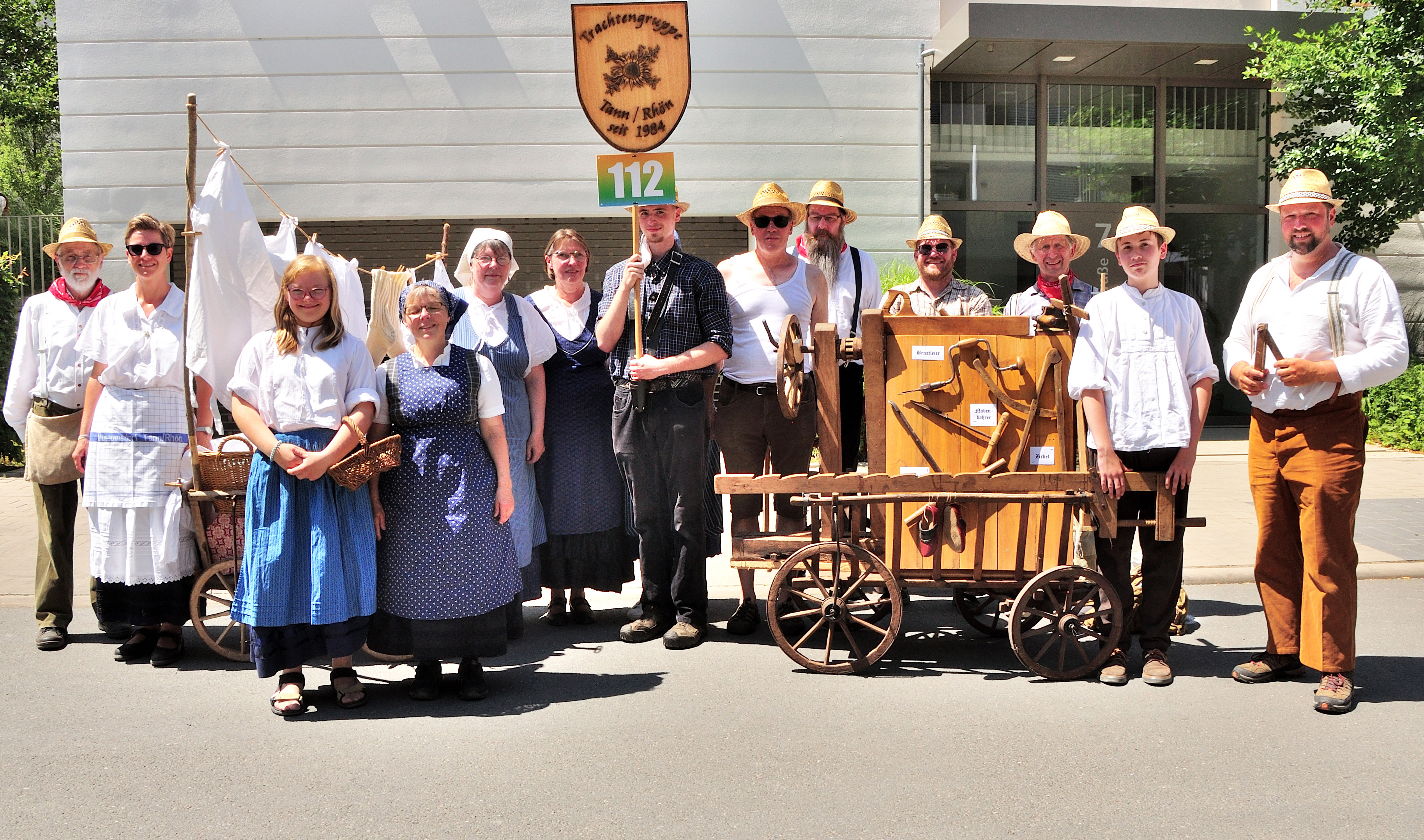 Die Zugnummer 112 der Trachtengruppe Tann (Rhön) stand unter dem Motto „Alltag in der Rhön im 19. Jahrhundert“. Die 14 Teilnehmer inkl. des frisch gewählten Bürgermeisters Matthias Gelbe stellten den Beruf des Stellmachers dar und zeigten, wie mühsam damals Wäsche gewaschen wurde.